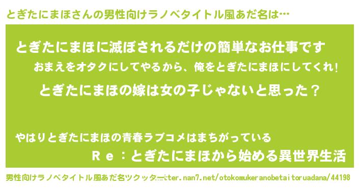 | 女子向けラノベタイトル風あだ名 | 『とぎたにまほの卵を拾いまして』 |