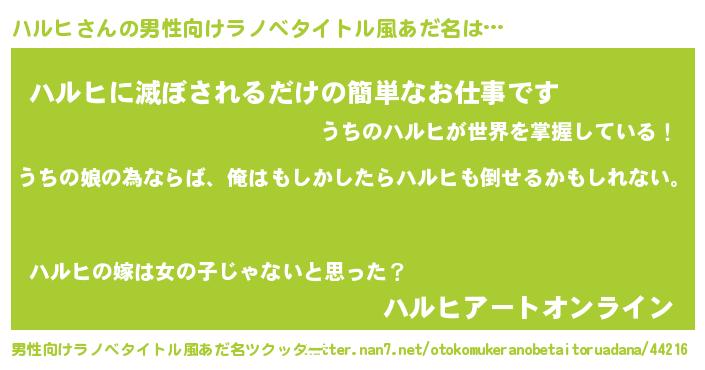 | 女子向けラノベタイトル風あだ名 | 『ハルヒ伯爵の花嫁』『ハルヒ様がみてる』 |