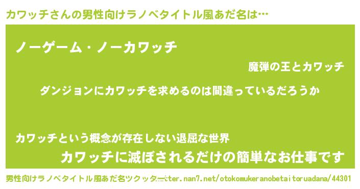 | 胡散臭い通販商品みたいなあだ名 | 『信頼と実績のサプリメント…その名も「カワッチ」』 |