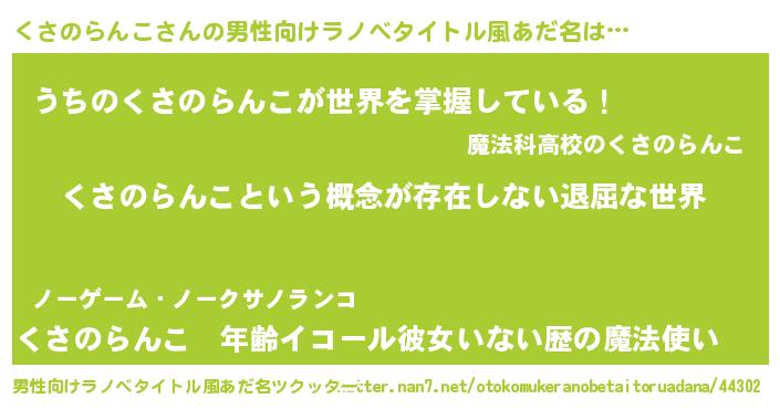 | 女子向けラノベタイトル風あだ名 | 『くさのらんこの契約王妃』 |