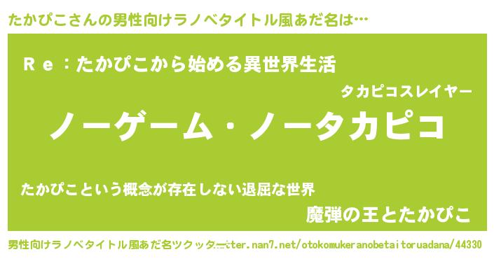 | 女子向けラノベタイトル風あだ名 | 『死神たかぴこの再婚』『闇のたかぴこ』 |