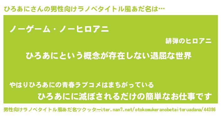 | 女子向けラノベタイトル風あだ名 | 『異世界で失敗しない100のひろあに』 |