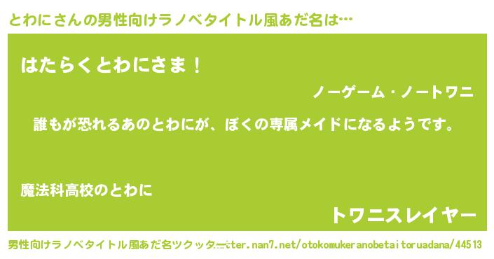 | 女子向けラノベタイトル風あだ名 | 『とわにの契約王妃』『死神とわにの再婚』 |