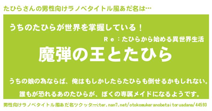 | 女子向けラノベタイトル風あだ名 | 『たひらが死なない童話 林檎のたひらの診療簿』 |
