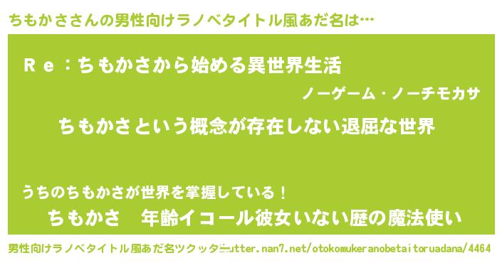 | 女子向けラノベタイトル風あだ名 | 『異世界で失敗しない100のちもかさ』 |