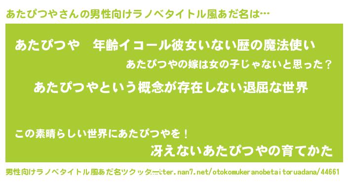 | 女子向けラノベタイトル風あだ名 | 『異世界で失敗しない100のあたぴつや』 |