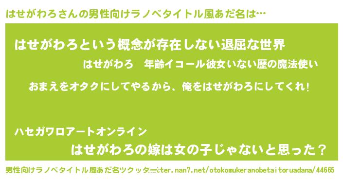 | 女子向けラノベタイトル風あだ名 | 『はせがわろ夫妻のなれそめ』 |