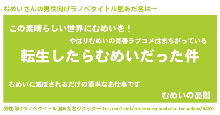 | 女子向けラノベタイトル風あだ名 | 『むめいの玉の輿計画!』 |