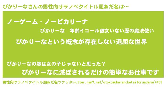 | 女子向けラノベタイトル風あだ名 | 『異世界で失敗しない100のぴかりーな』 |
