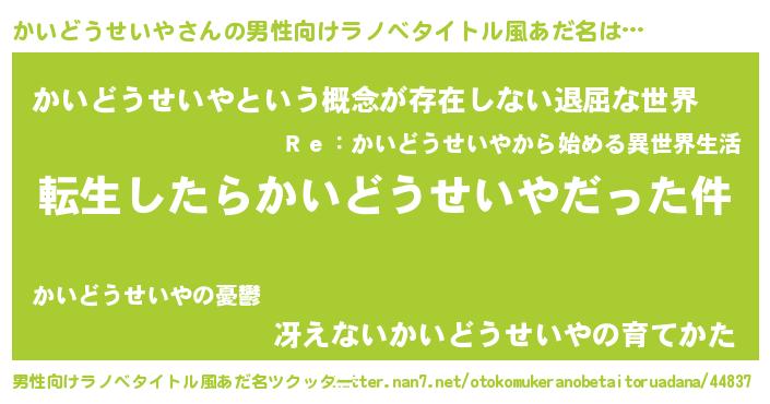 | 胡散臭い通販商品みたいなあだ名 | 『来世でも幸せになれる健康食品…その名も「かいどうせいや」』 |