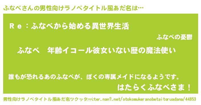 | 女子向けラノベタイトル風あだ名 | 『ふなべの玉の輿計画!』 |