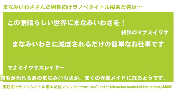 | 胡散臭い通販商品みたいなあだ名 | 『あなたにだけ特別に提供する限定10本のレアな日本酒…その名も「まなみいわさ」』 |