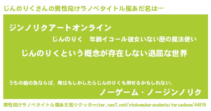 女子向けラノベタイトル風あだ名 | 『異世界で失敗しない100のじんのりく』 |