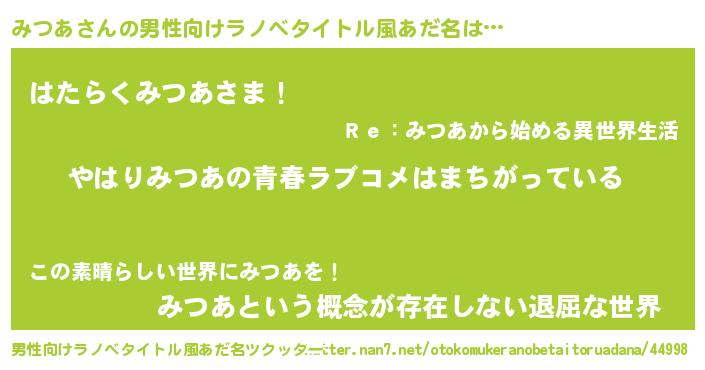 | 女子向けラノベタイトル風あだ名 | 『みつあ伯爵の花嫁』『闇のみつあ』 |
