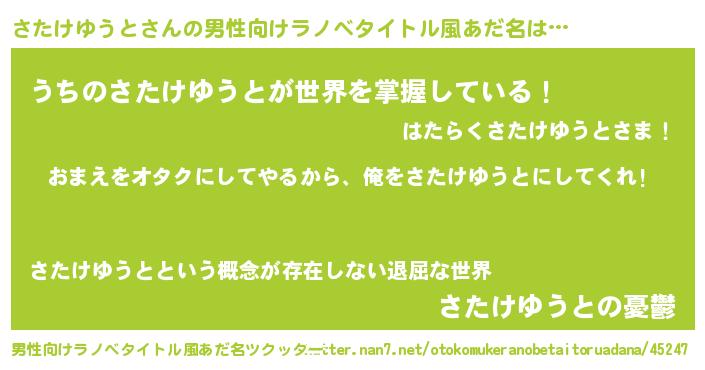 | 女子向けラノベタイトル風あだ名 | 『さたけゆうと夫妻のなれそめ』 |