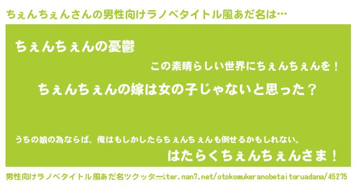 | 女子向けラノベタイトル風あだ名 | 『ちぇんちぇんの卵を拾いまして』 |