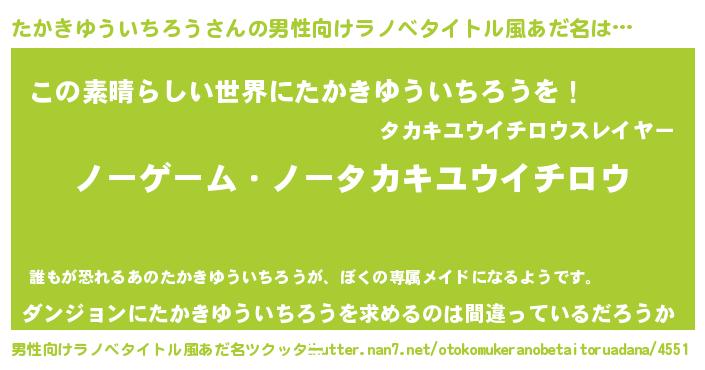 | 女子向けラノベタイトル風あだ名 | 『死神たかきゆういちろうの再婚』 |