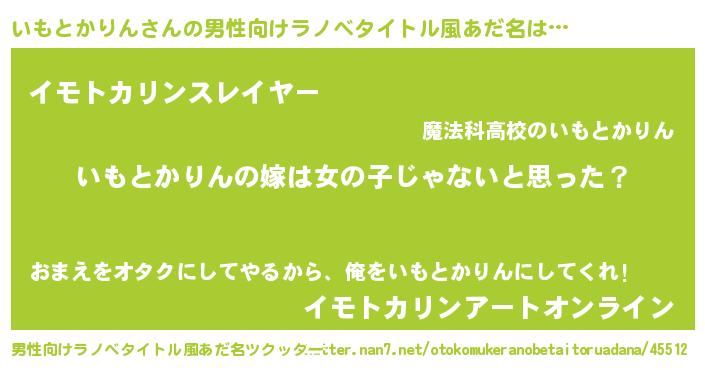 | 女子向けラノベタイトル風あだ名 | 『いもとかりんの卵を拾いまして』 |