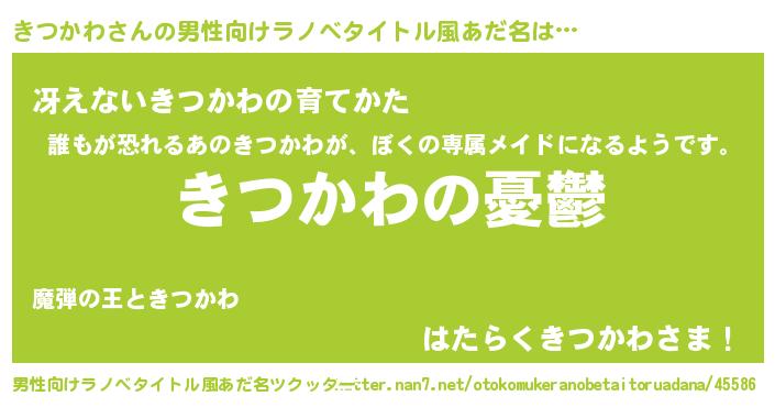 | 女子向けラノベタイトル風あだ名 | 『(仮)きつかわのやんごとなき事情』 |