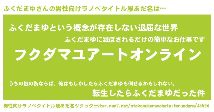 | 女子向けラノベタイトル風あだ名 | 『誰かこのふくだまゆを説明してください! ~契約から始まるウェディング~』 |