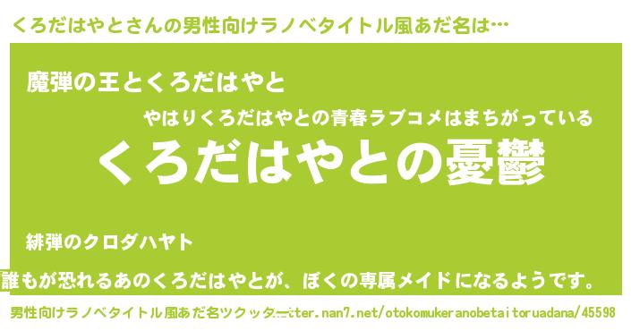 | 胡散臭い通販商品みたいなあだ名 | 『モテモテ間違いなし霊験あらたかなお札…その名も「くろだはやと」』 |