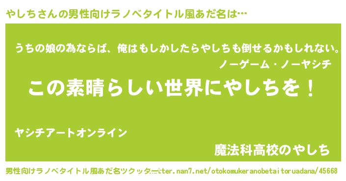 | 胡散臭い通販商品みたいなあだ名 | 『あなたにだけ特別に提供する世界で10本だけ現存している希少なブランデー…その名も「やしち」』 |