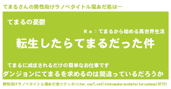 | 女子向けラノベタイトル風あだ名 | 『てまるの玉の輿計画!』 |
