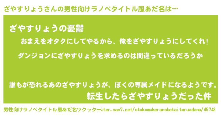 | 女子向けラノベタイトル風あだ名 | 『ざやすりょうの卵を拾いまして』 |