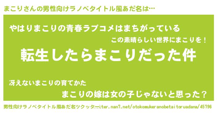 | 女子向けラノベタイトル風あだ名 | 『婚約破棄系悪役まこりに転生したので、保身に走りました。』 |