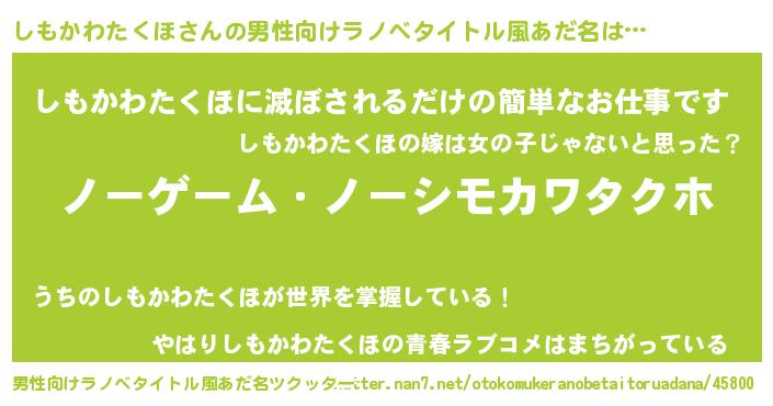 | 女子向けラノベタイトル風あだ名 | 『死神しもかわたくほの再婚』 |