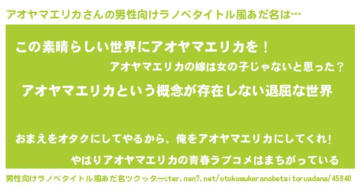 | 女子向けラノベタイトル風あだ名 | 『異世界で失敗しない100のアオヤマエリカ』 |