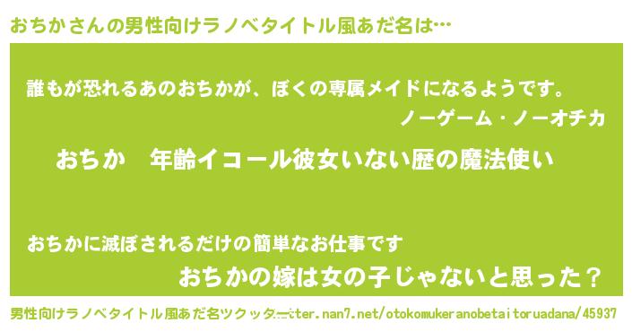 | 女子向けラノベタイトル風あだ名 | 『おちかの玉の輿計画!』 |