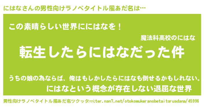 | 女子向けラノベタイトル風あだ名 | 『にはなの玉の輿計画!』 |