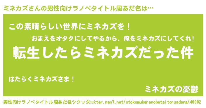 | 女子向けラノベタイトル風あだ名 | 『ミネカズの玉の輿計画!』 |