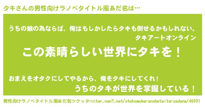 | 女子向けラノベタイトル風あだ名 | 『乙女ゲームの破滅フラグしかない悪役タキに転生してしまった…』 |