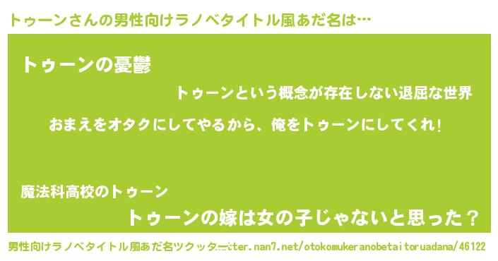 | 女子向けラノベタイトル風あだ名 | 『トゥーン夫妻のなれそめ』 |