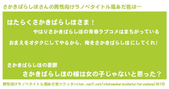 | 女子向けラノベタイトル風あだ名 | 『さかきばらしほ夫妻のなれそめ』 |