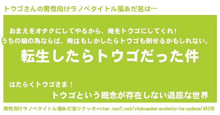 | 女子向けラノベタイトル風あだ名 | 『婚約破棄系悪役トウゴに転生したので、保身に走りました。』 |