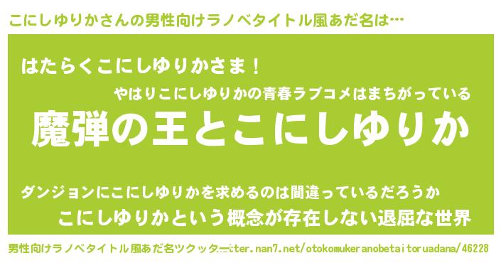 | 女子向けラノベタイトル風あだ名 | 『こにしゆりかが死なない童話 林檎のこにしゆりかの診療簿』 |