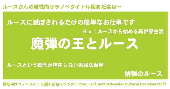 | 女子向けラノベタイトル風あだ名 | 『ルースが死なない童話 林檎のルースの診療簿』 |