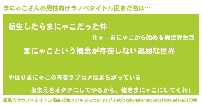 | 胡散臭い通販商品みたいなあだ名 | 『来世でも幸せになれる水素水…その名も「まにゃこ」』 |