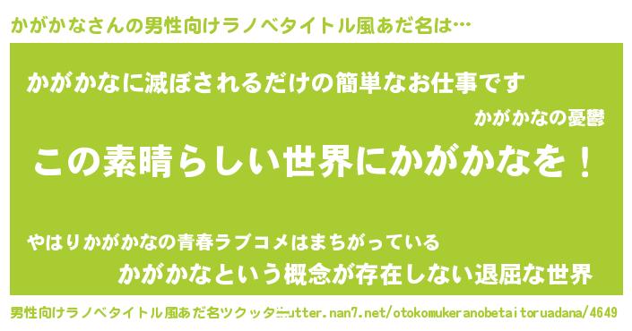 | 女子向けラノベタイトル風あだ名 | 『乙女ゲームの破滅フラグしかない悪役かがかなに転生してしまった…』 |