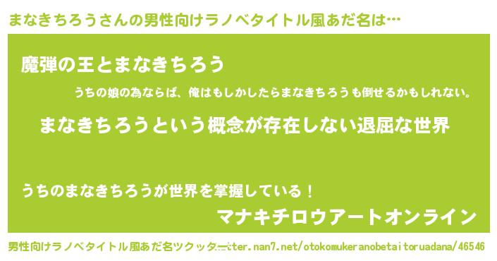| 女子向けラノベタイトル風あだ名 | 『異世界で失敗しない100のまなきちろう』 |