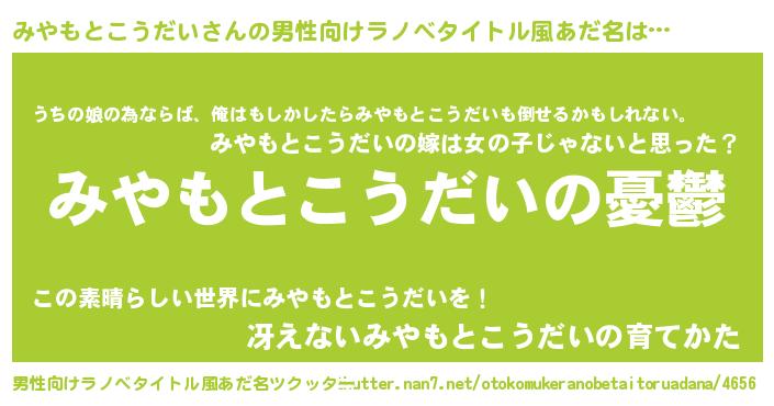 | 女子向けラノベタイトル風あだ名 | 『(仮)みやもとこうだいのやんごとなき事情』 |
