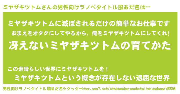 | 胡散臭い通販商品みたいなあだ名 | 『来世でも幸せになれる健康食品…その名も「ミヤザキツトム」』 |