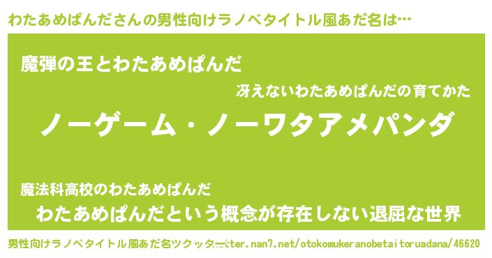 | 女子向けラノベタイトル風あだ名 | 『わたあめぱんだ恋絵巻』 |