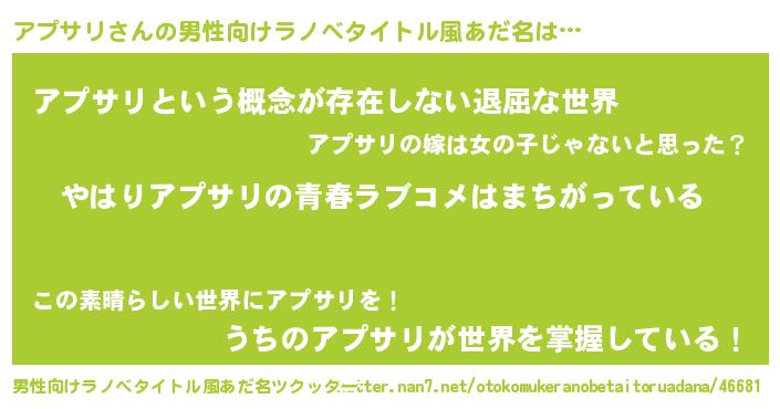 | 女子向けラノベタイトル風あだ名 | 『アプサリの雑貨屋さん』 |