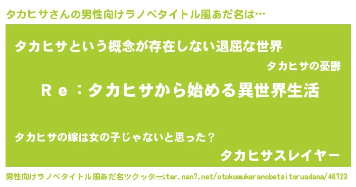 | 女子向けラノベタイトル風あだ名 | 『闇のタカヒサ』『タカヒサの契約王妃』 |