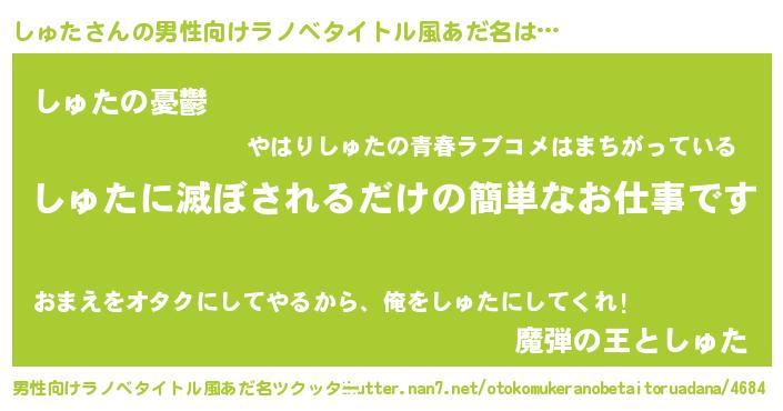 | 胡散臭い通販商品みたいなあだ名 | 『モテモテ間違いなしブレスレット…その名も「しゅた」』 |
