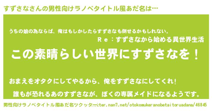 | 女子向けラノベタイトル風あだ名 | 『悪役すずさなに転生したようですが、知った事ではありません』 |